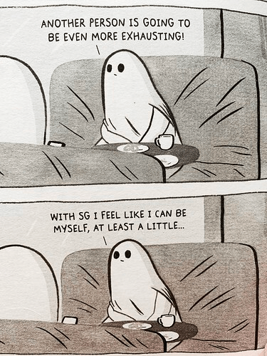 Following on from the first book, SG and Socks are trying to make new friends and find people similar to them. It’s the morning after they met in the first volume, and SG (Sam) is ready to make new friends, whereas Socks is struggling with the idea. I loved the mixture of dialogue (which was shown in speech bubbles) and inner thoughts (shown below), and I related to Socks so much.